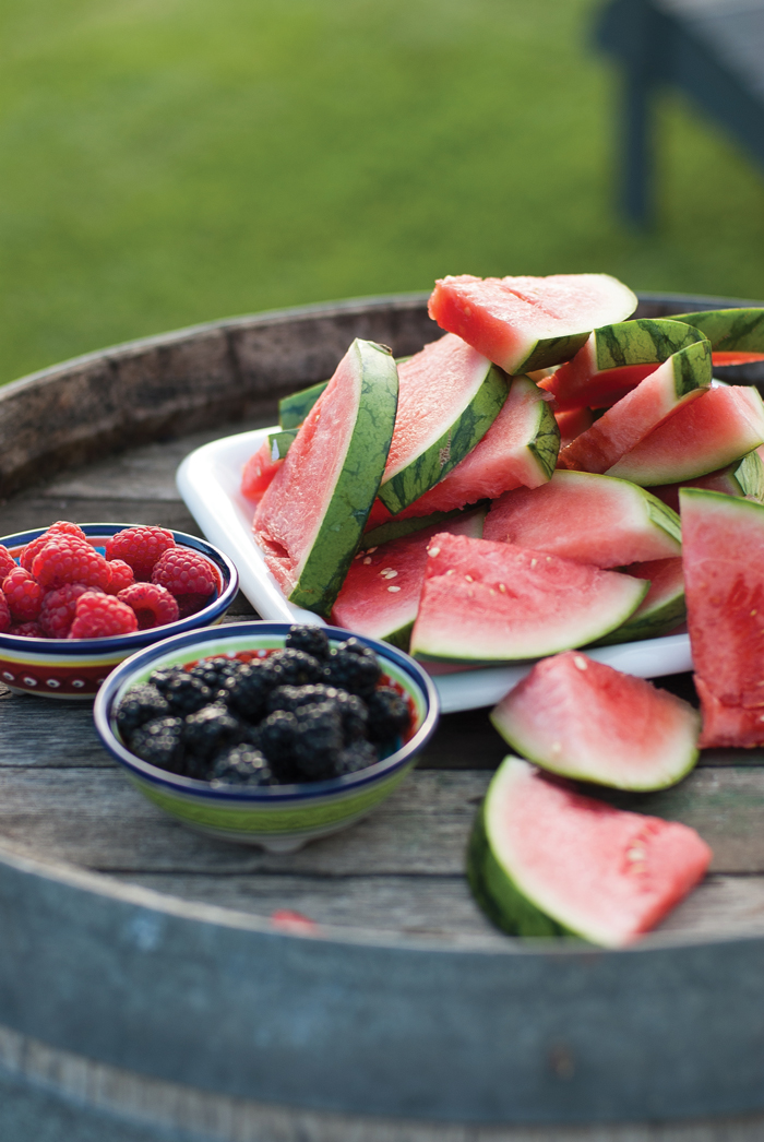 What is the best way to display your food and decorate the table? Place your nibbles on wood platters and in colorful bowls; then set them down the middle of the table. Throw in a few vases (or glasses) and fill them with fresh greens and flowers from your yard. With that, you have an elegant and relaxed table—filled with great food and friends.